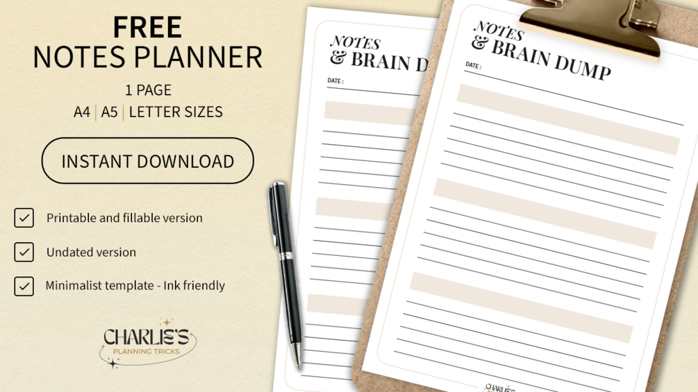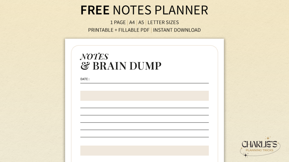🌠FREE MINIMALIST NOTES & BRAIN DUMP PLANNER CREATED BY CHARLIE’S PLANNING TRICKS  - PRINTABLE AND FILLABLE PDF🌠