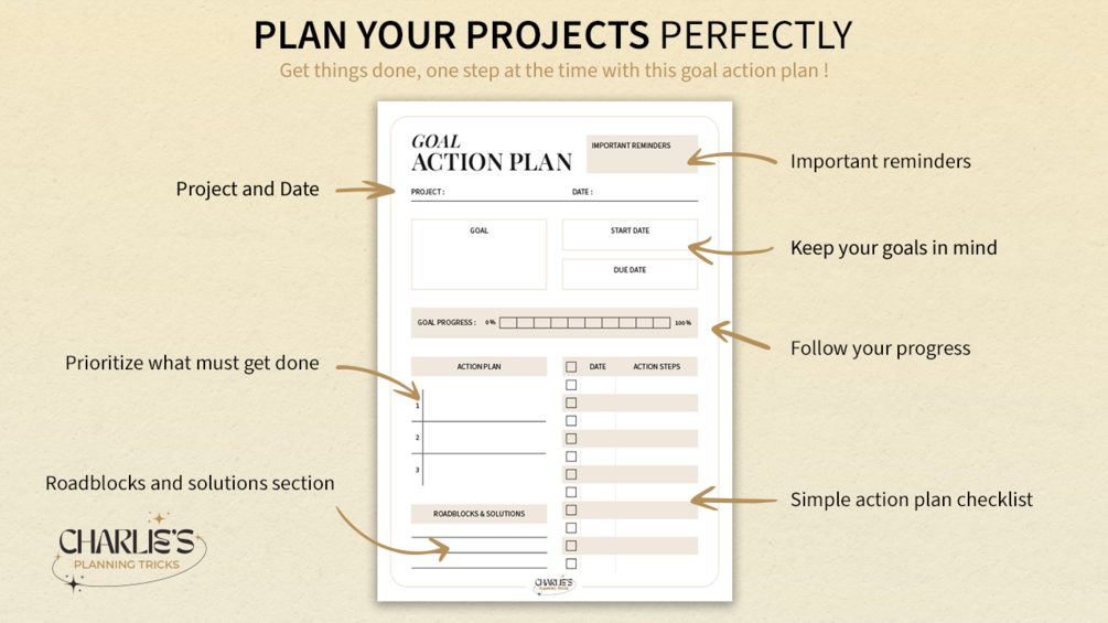 🌠MINIMALIST GOAL ACTION PLAN CREATED BY CHARLIE’S PLANNING TRICKS  - PRINTABLE AND FILLABLE PDF🌠