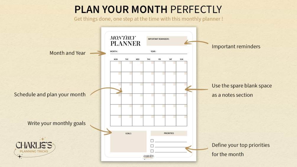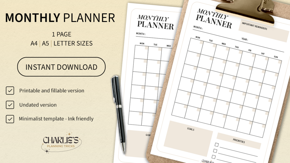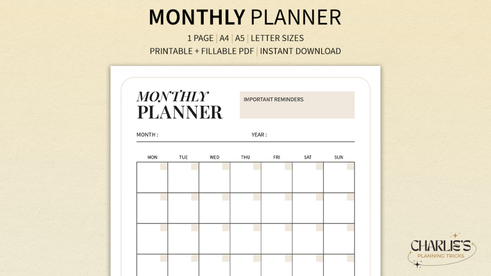 🌠MINIMALIST MONTHLY PLANNER CREATED BY CHARLIE’S PLANNING TRICKS - PRINTABLE AND FILLABLE PDF🌠