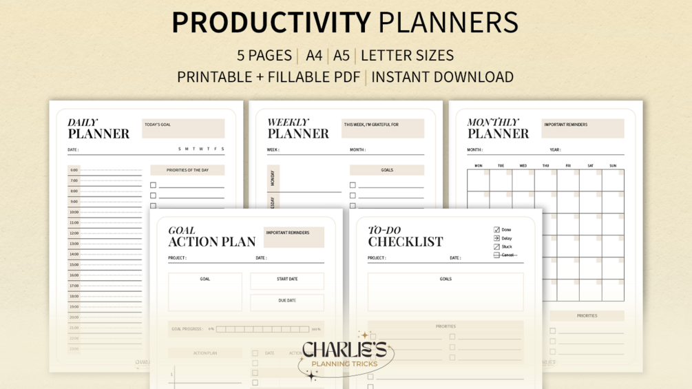 🌠MINIMALIST PRODUCTIVITY PLANNERS BUNDLE CREATED BY CHARLIE’S PLANNING TRICKS - PRINTABLE AND FILLABLE PDF🌠