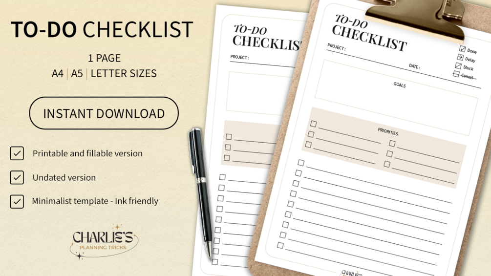 🌠MINIMALIST TO-DO CHECKLIST CREATED BY CHARLIE’S PLANNING TRICKS - PRINTABLE AND FILLABLE PDF🌠